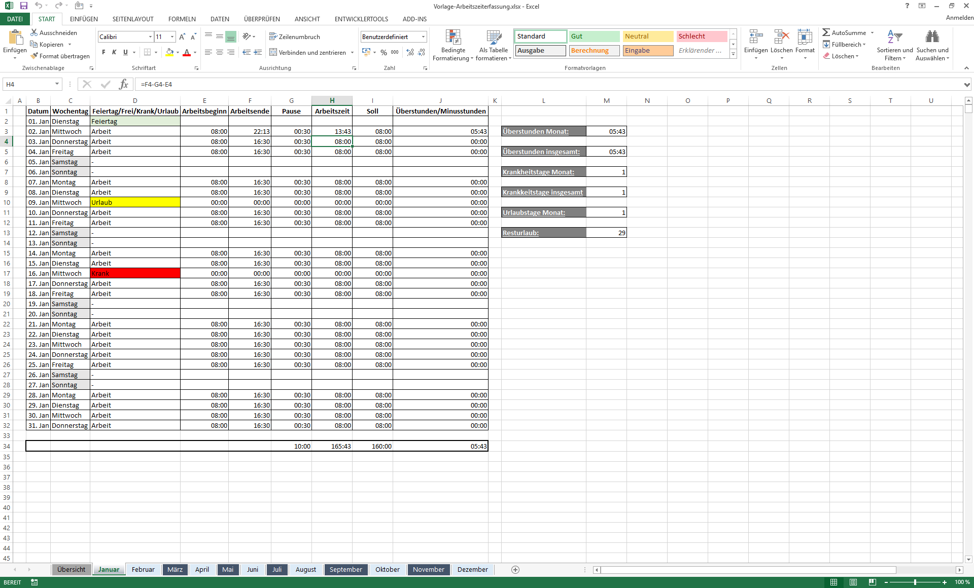 2. Formeln für die Arbeitszeiterfassung
