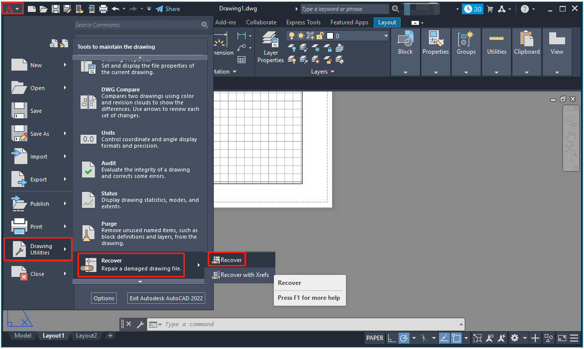 ALLEWIEDERHERST | Repariert eine beschädigte Zeichnung mit allen zugehörigen XRefs. |