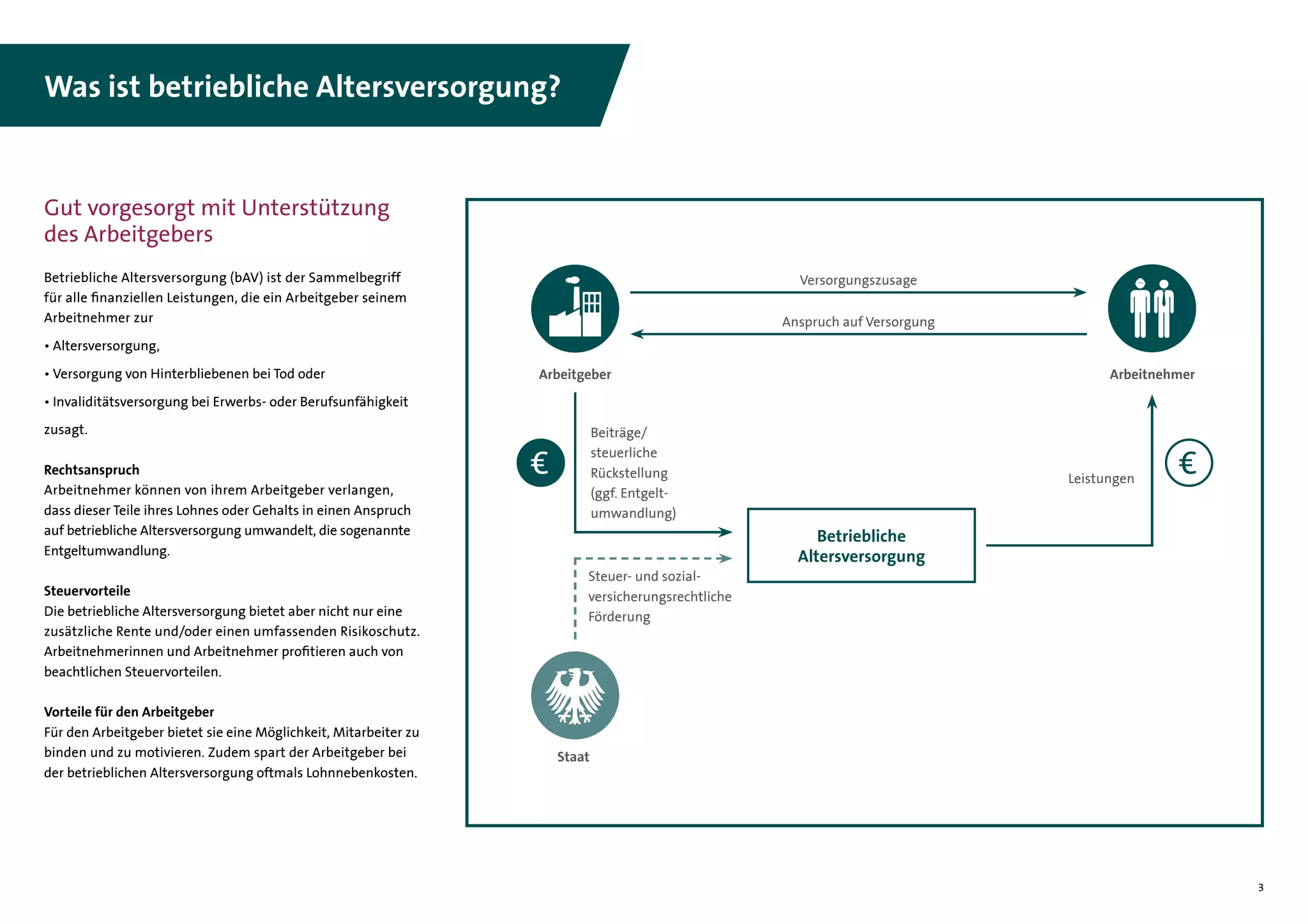 Die Entgeltumwandlung ermöglicht es Arbeitnehmern, Teile ihres Brutto-Entgelts steuer- und sozialabgabenfrei in Anwartschaften auf betriebliche Altersversorgung umzuwandeln. Erst in der Leistungsphase werden Steuern und Sozialabgaben fällig. Gemäß dem Betriebsrentengesetz (BetrAVG) können Arbeitnehmer verlangen, dass bis zu 4 % der Beitragsbemessungsgrenze in der Rentenversicherung für die bAV verwendet werden. Arbeitgeber sind grundsätzlich verpflichtet, 15 % des umgewandelten Entgelts als Zuschuss zu leisten, sofern sie durch die Entgeltumwandlung Sozialversicherungsbeiträge einsparen. Dieser Zuschuss ist jedoch nur bei Durchführung über einen Pensionsfonds, eine Pensionskasse oder eine Direktversicherung relevant.