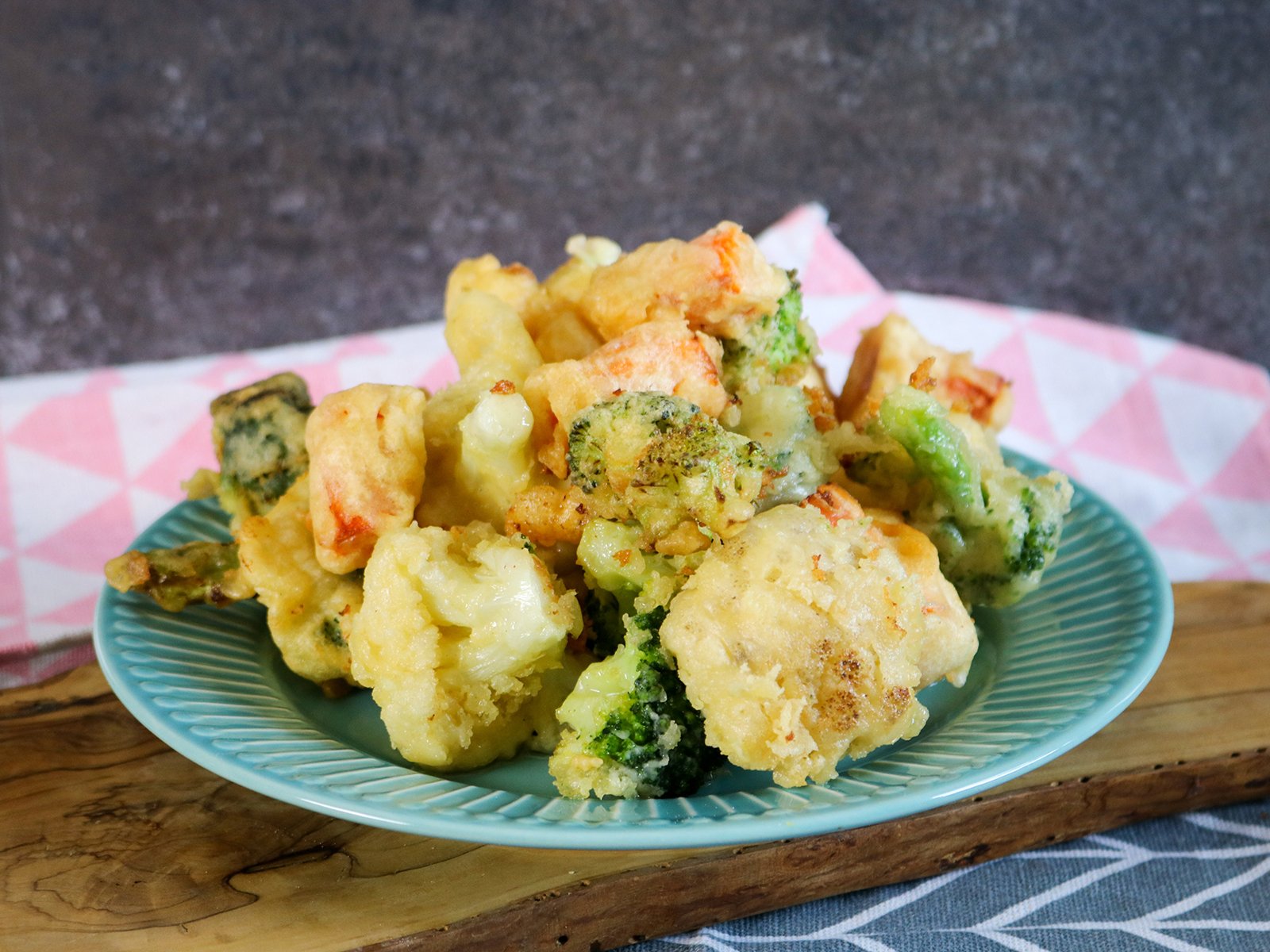 - Blumenkohlröschen erst in Mehl, dann im Bierteig wenden und ca. 5-6 Minuten goldbraun frittieren.