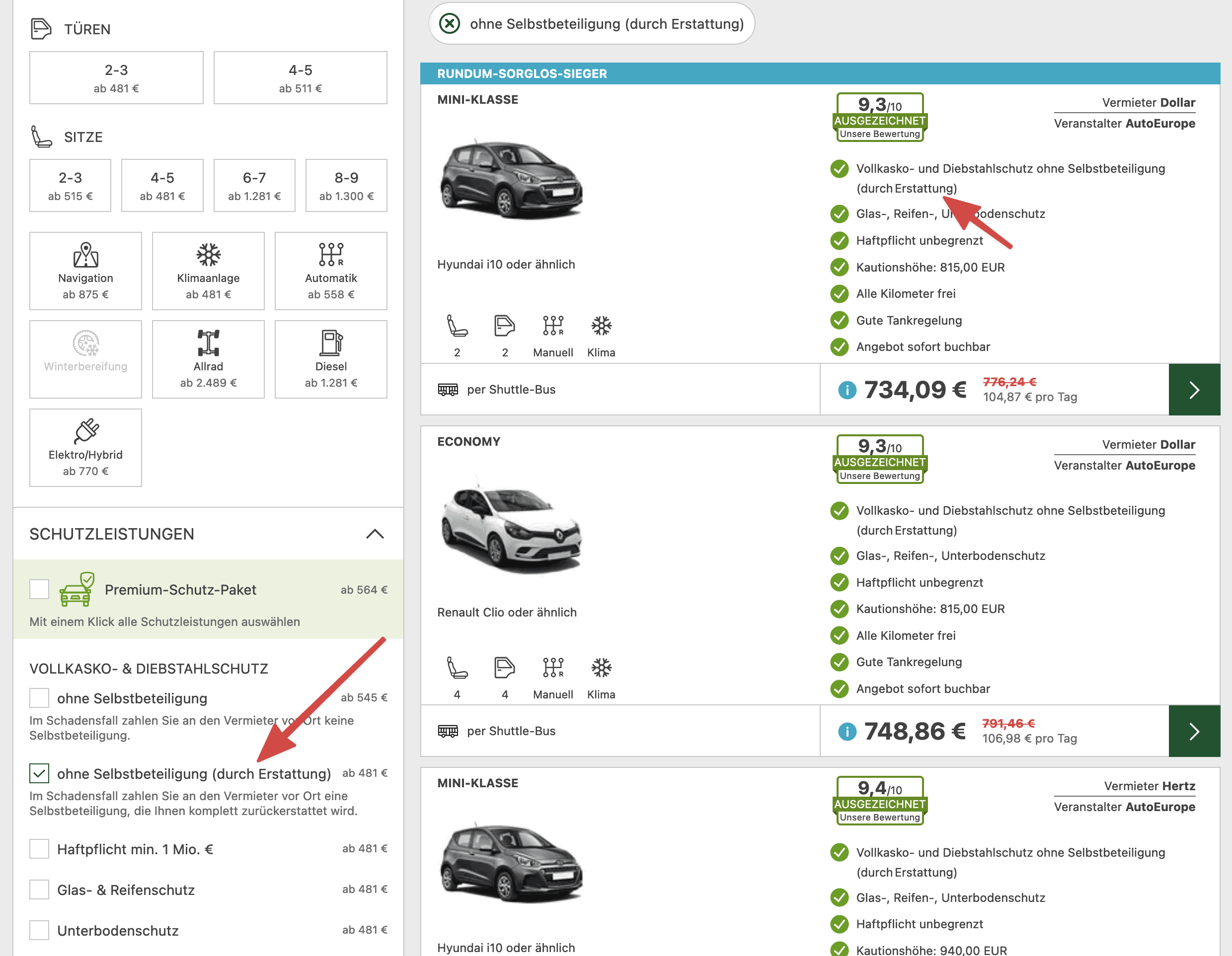 Es werden verschiedene Schutzpakete angeboten, die mehrere Versicherungsleistungen kombinieren. Die Kosten hierfür liegen zwischen 51,50 EUR und 73,00 EUR pro Tag. Erkundigen Sie sich bei der Buchung oder vor Ort nach den verfügbaren Optionen.