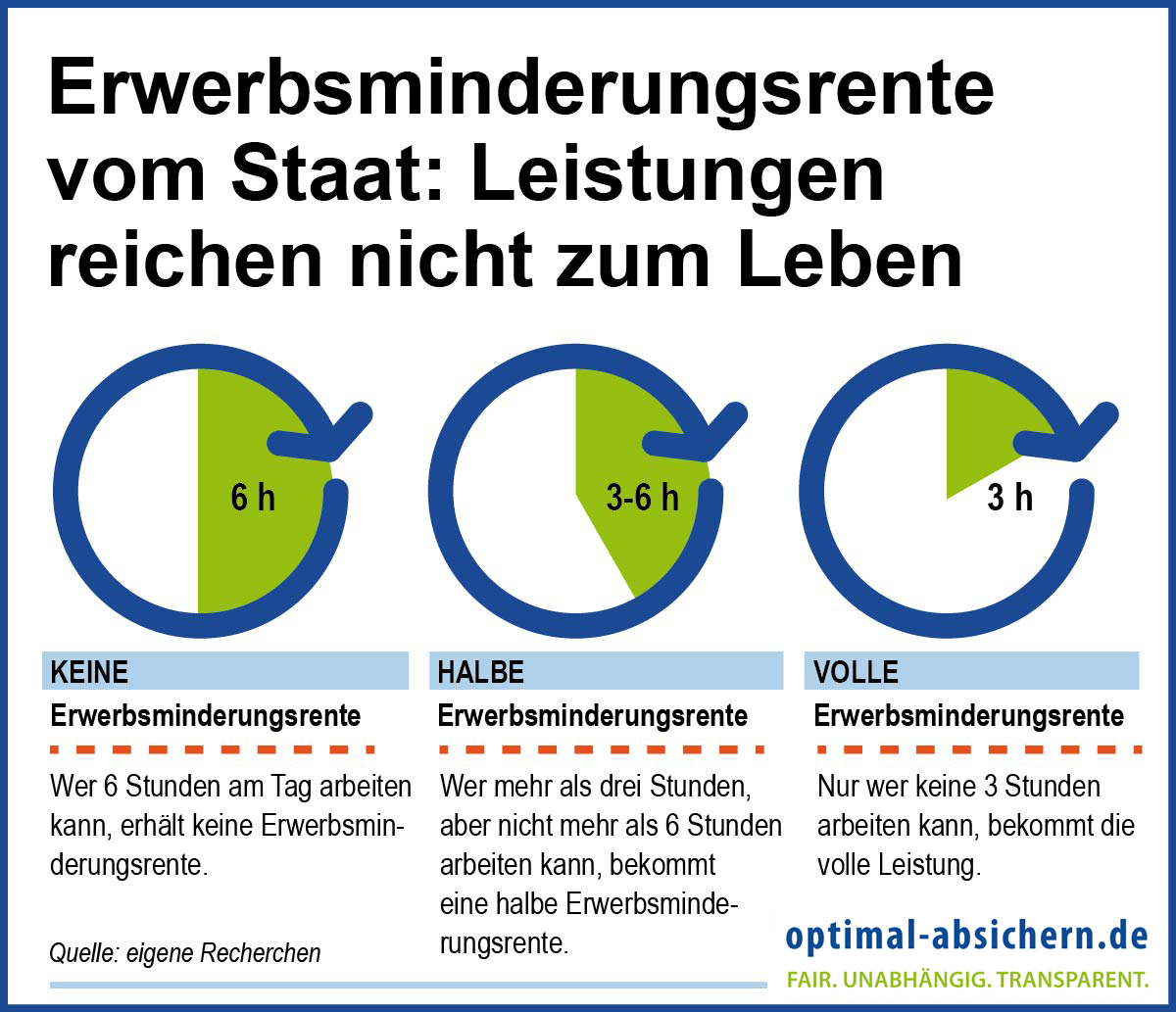 Eine Rente wegen teilweiser Erwerbsminderung erhalten Sie, wenn Sie noch mindestens drei, aber weniger als sechs Stunden täglich arbeiten können. Auch hier gilt, dass die Einschränkung für alle Tätigkeiten gilt. Die Rente ist halb so hoch wie die volle Erwerbsminderungsrente und dient zur Ergänzung Ihres Einkommens aus einer Teilzeitarbeit.