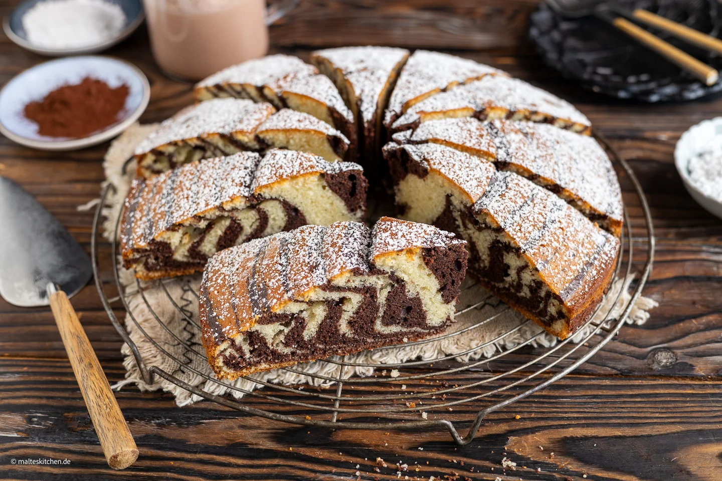 - Puderzucker: Ich persönlich liebe den Zebrakuchen, wenn er leicht mit Puderzucker bestäubt wird. Er schmeckt aber auch hervorragend mit Zuckerguss oder einer Schokoladenglasur.