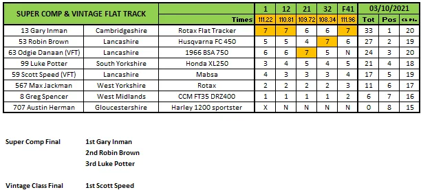 Luke Gardner blieb in der Flat Track-Klasse ungeschlagen, aber es reichte nicht aus, um Jack Bell den Titel abzunehmen. Bell gewann die Meisterschaft, obwohl er bei diesem Lauf fehlte, da er ihn als seinen Streichlauf nutzte. Gardner beendete die Serie vier Punkte hinter Bell, Terry Pywell wurde Dritter, nachdem er im Finale Zweiter geworden war.