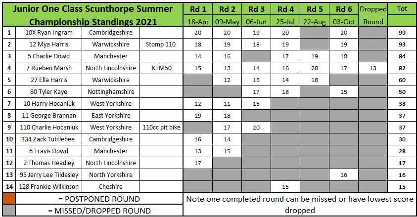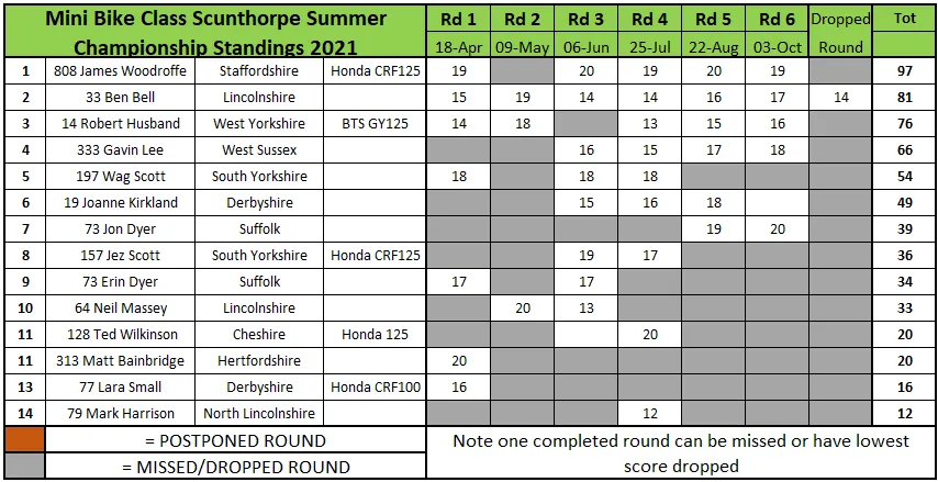 Jon Dyer ratterte in den Minibikes fünf Vorlaufsiege herunter und verbuchte einen weiteren im Finale vor dem späteren Champion Gavin Lee und Ben Bell. Der Titel ging jedoch an James Woodruffe, der eine fantastische Saison hatte.