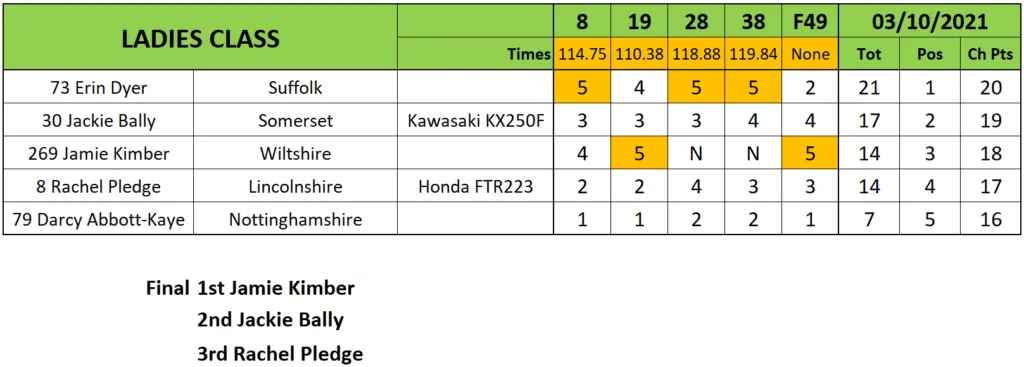 Ein paar Fehlstarts für Jaime Kimber behinderten ihren Fortschritt in der Damenklasse, aber sie war gut, als es im Finale darauf ankam, um vor der dreifachen Vorlaufsiegerin Erin Dyer und Rachel Pledge zu gewinnen, die mit nur einem Punkt Vorsprung vor Jackie Bally zur Meisterin gekrönt wurde.