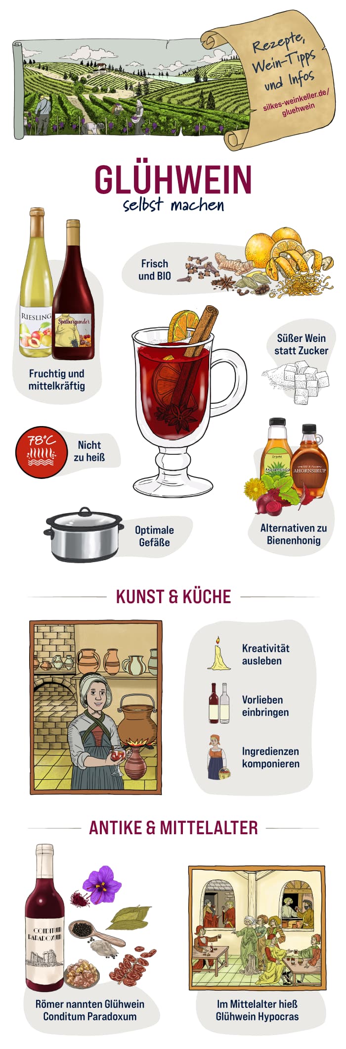Der Ursprung des Glühweins lässt sich bis in die Antike zurückverfolgen, wo gewürzte Weine wie “Conditum Paradoxum” genossen wurden. Auch im Mittelalter war ein mit Gewürzen verfeinerter Wein, bekannt als Hypocras, sehr beliebt. Erste nachweisbare Rezepte für Glühwein in Deutschland stammen aus dem 19. Jahrhundert und enthielten bereits Zutaten wie Anis, Muskat, Kardamom, Honig und Zucker. Die kommerzielle Verfügbarkeit von fertigem Glühwein begann im Jahr 1956, doch für Genießer, die das Besondere suchen, bleibt die eigene Herstellung die erste Wahl.