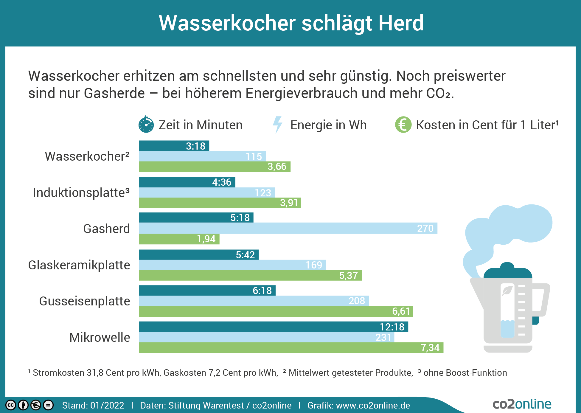 Für die Zubereitung des Spinats verbraucht die Mikrowelle etwa 0,06 Kilowattstunden, was nach gängigen Strompreisen ungefähr zwei Cent entspricht. Die Zubereitung auf dem Ceranfeld hingegen dauerte etwa 15 Minuten und verbrauchte rund 0,23 Kilowattstunden, was gut sieben Cent kostet – fast das Vierfache bei höherem Zeitaufwand. Spartipps Fünf Tipps, um mit dem Wasserkocher Energie zu sparen.