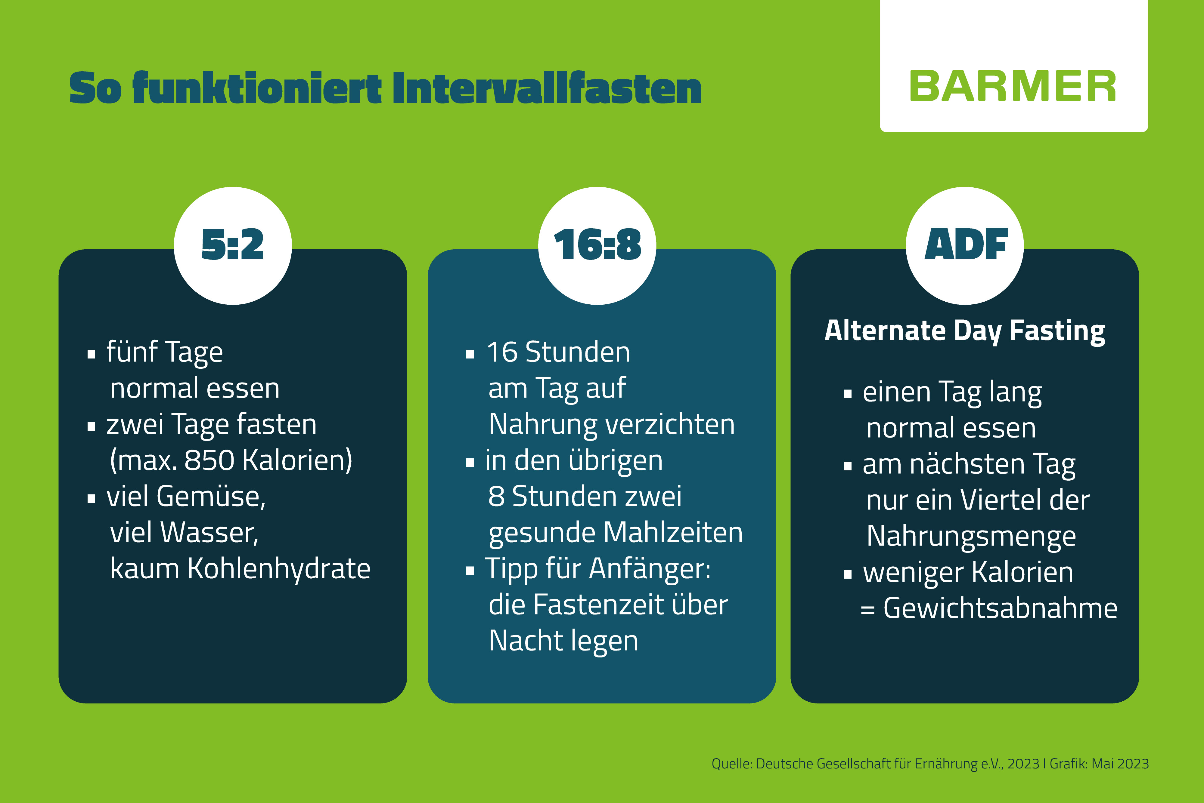 - 5:2-Methode: An fünf Tagen der Woche wird normal gegessen, während an zwei Tagen die Kalorienzufuhr stark reduziert wird (ca. 500-850 kcal, je nach Geschlecht).