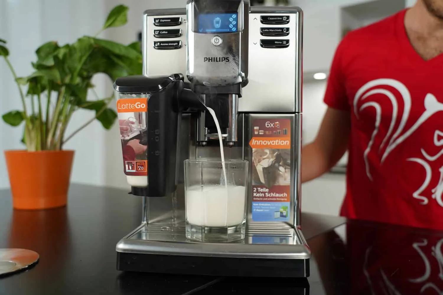 Modelle mit Dampflanze (z.B. DeLonghi Magnifica S) oder spezielle Geräte mit Mix-Karaffe (DeLonghi Maestosa) sind gut geeignet. Auch Modelle wie der Jura S8 oder Krups Intuition Experience+ bieten flexible Möglichkeiten.