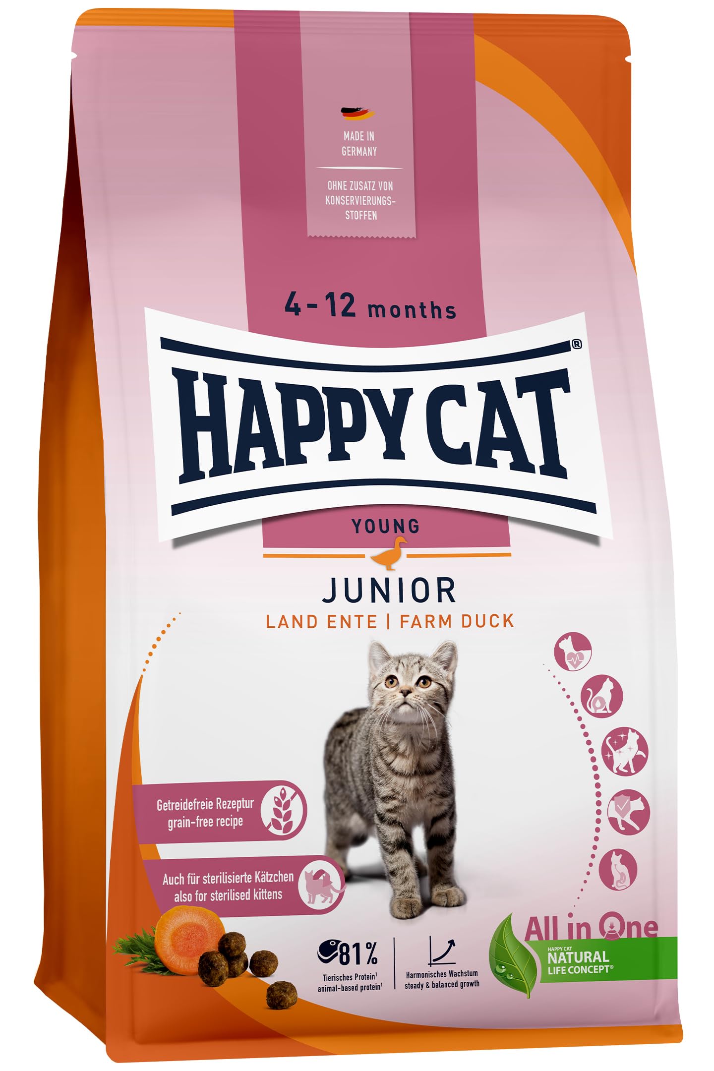 Ähnlich wie bei den Produkten für erwachsene Katzen basiert auch dieses Junior-Trockenfutter auf dem “All in One”-Konzept. Dies bedeutet, dass alle essenziellen Nährstoffe, Vitamine und Mineralstoffe enthalten sind, um die wichtigsten Bedürfnisse Ihrer jungen Katze abzudecken. Happy Cat Young Junior Farm Duck unterstützt nicht nur das Immunsystem und die Verdauung, sondern trägt auch zur Herzgesundheit und zur Funktion des Harntrakts bei. Damit legen Sie den Grundstein für ein vitales und langes Katzenleben.
