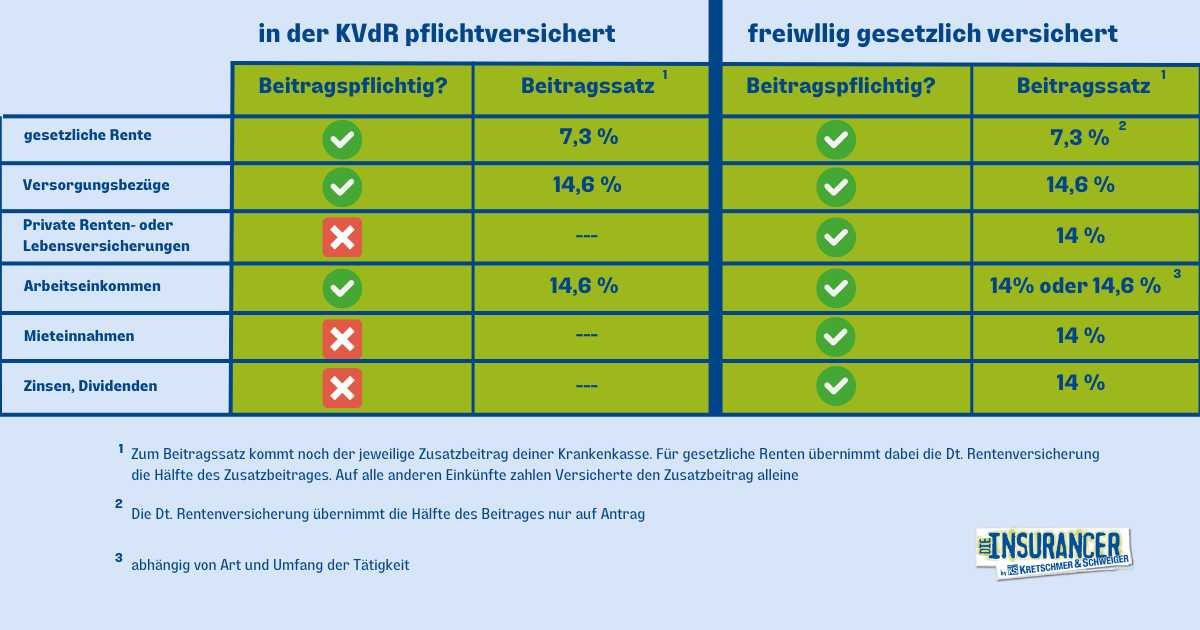 Grundsätzlich gilt für Rentner die Regel: “Im Ruhestand sind Sie kranken- und pflegeversichert wie im bisherigen Erwerbsleben.” Das bedeutet, dass die Art der Krankenversicherung, die während des Erwerbslebens bestand, in der Regel auch im Rentenalter fortgeführt wird. Dies betrifft die meisten Leistungen, mit Ausnahme des Krankengeldes. Rentner zahlen weiterhin Beiträge an ihre Krankenkasse, um diesen Versicherungsschutz aufrechtzuerhalten.