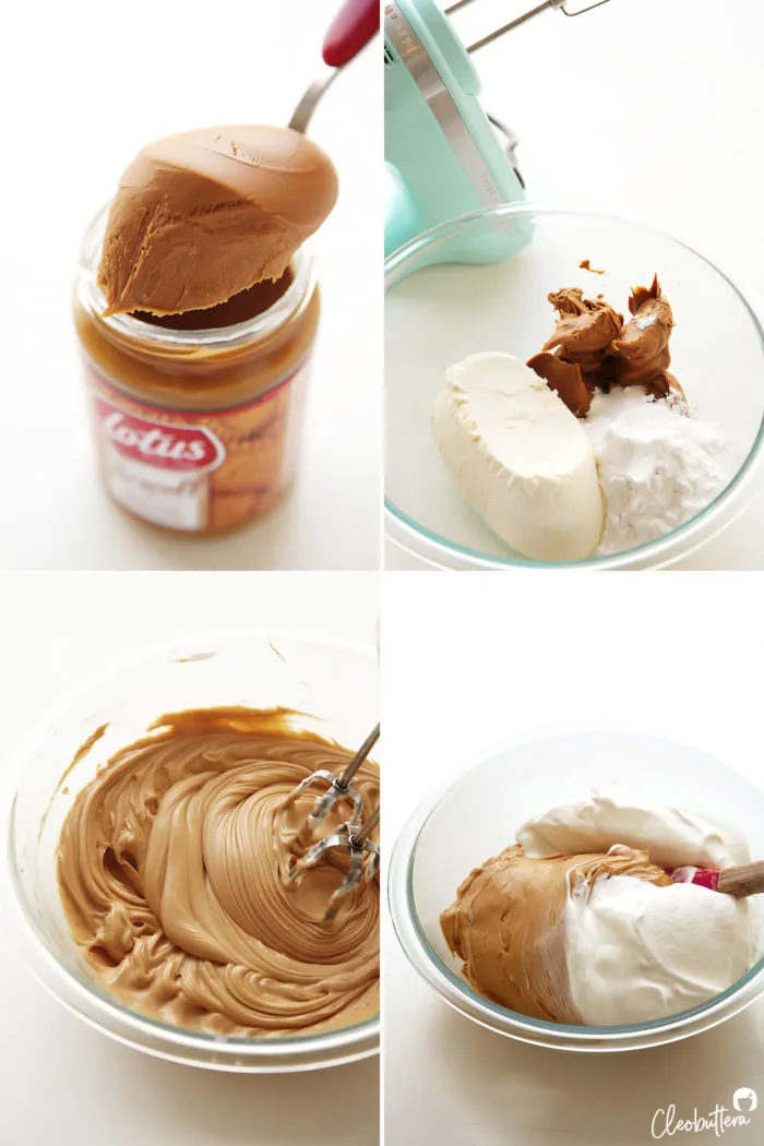 - Schlagen Sie Frischkäse, Lotus Biscoff Aufstrich, Puderzucker und eine Prise Salz zusammen, bis alles schön cremig ist.