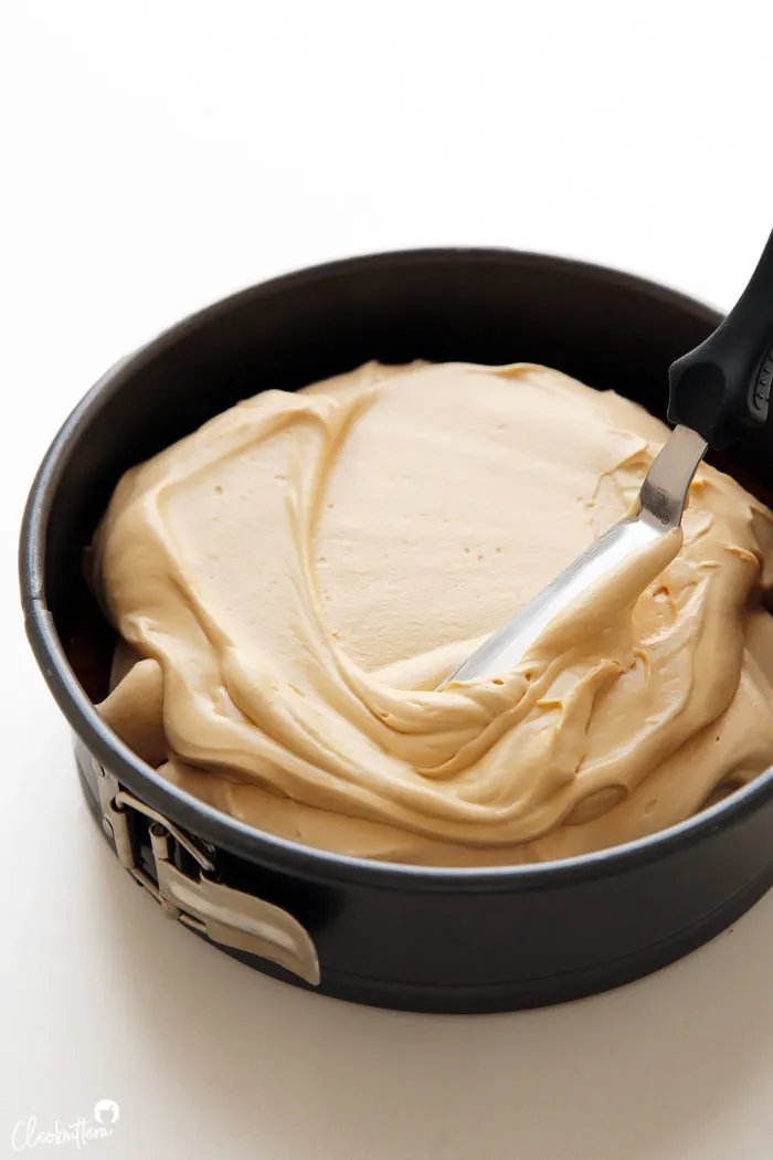 - Die Füllung auf den abgekühlten Kekskuchenboden schaben und mit einem Winkelspatel oder dem Rücken eines Löffels zu einer gleichmäßigen Schicht verstreichen und die Oberfläche glätten.