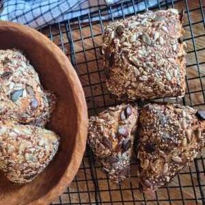 - Roggenvollkornmehl (idealerweise selbstgemahlen): Das Mahlen des gesamten Roggenkorns, einschließlich Schale und Keimling, bewahrt die volle Bandbreite an Nährstoffen wie Ballaststoffen, Mineralstoffen und Vitaminen. Selbstgemahlenes Mehl verleiht den mehrkornbrötchen einen herzhaften Geschmack und eine tiefere Farbe. Wenn keine eigene Getreidemühle vorhanden ist, kann natürlich auch gekauftes Vollkornmehl verwendet werden.
