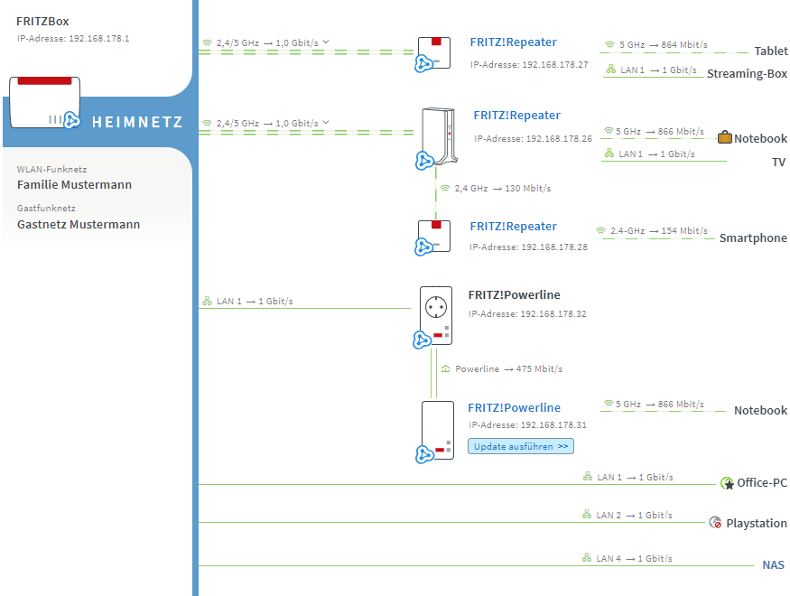 - Mesh-Übersicht: Sehen Sie auf einen Blick, welche FRITZ!-Geräte aktiv sind und wie Ihre Endgeräte verbunden sind. Updates können zentral von der FRITZ!Box aus gestartet werden.