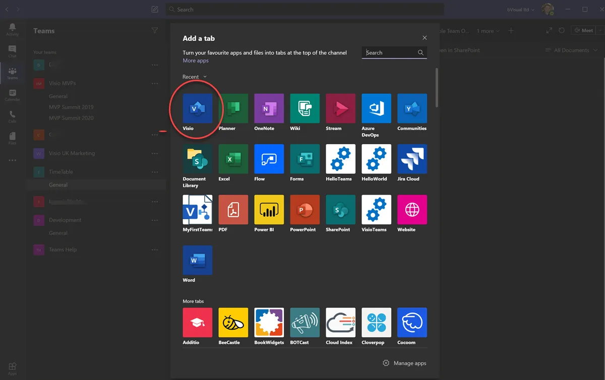 Es gibt viele Möglichkeiten, einen neuen Tab zu einem Kanal in Teams hinzuzufügen, und Visio ist jetzt eine davon. Weitere Informationen finden Sie unter Visio als Tab in Microsoft Teams ist allgemein verfügbar.