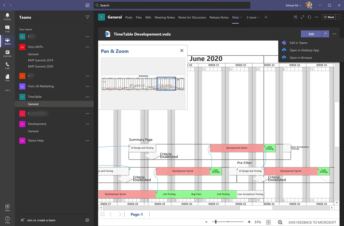 Visio-Dokumente, die zuvor mit einer Visio für Desktop-Edition erstellt wurden, können in den Ordner “Dateien” eines Teams-Kanals hochgeladen werden. Dort können sie im Visio für Web im Lesemodus überprüft werden. Da jedoch viele Visio-Dokumente Elemente enthalten können, die in Visio für Web noch nicht bearbeitet werden können, bleibt das Dokument im Lesemodus oder kann, falls installiert, in einer Visio für Desktop-Edition geöffnet werden.