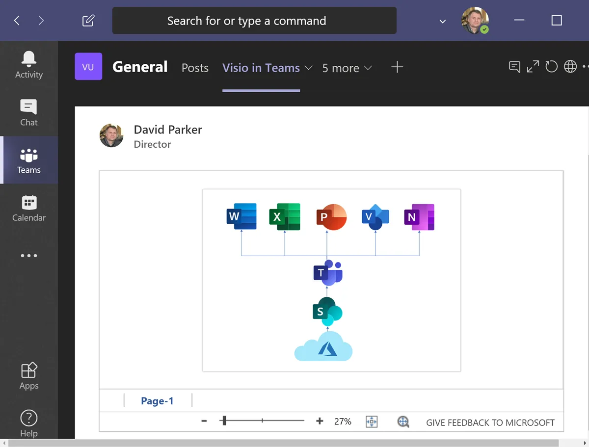 Teams-Benutzer mit einer Visio für Web-Lizenz (Visio Plan 1 oder 2) können Kommentare direkt zu einer Seite oder Form innerhalb des Visio-Dokuments hinzufügen. Sie können auch Visio-Zeichnungen erstellen oder bearbeiten, die mit anderen in Teams-Kanälen geteilt werden.