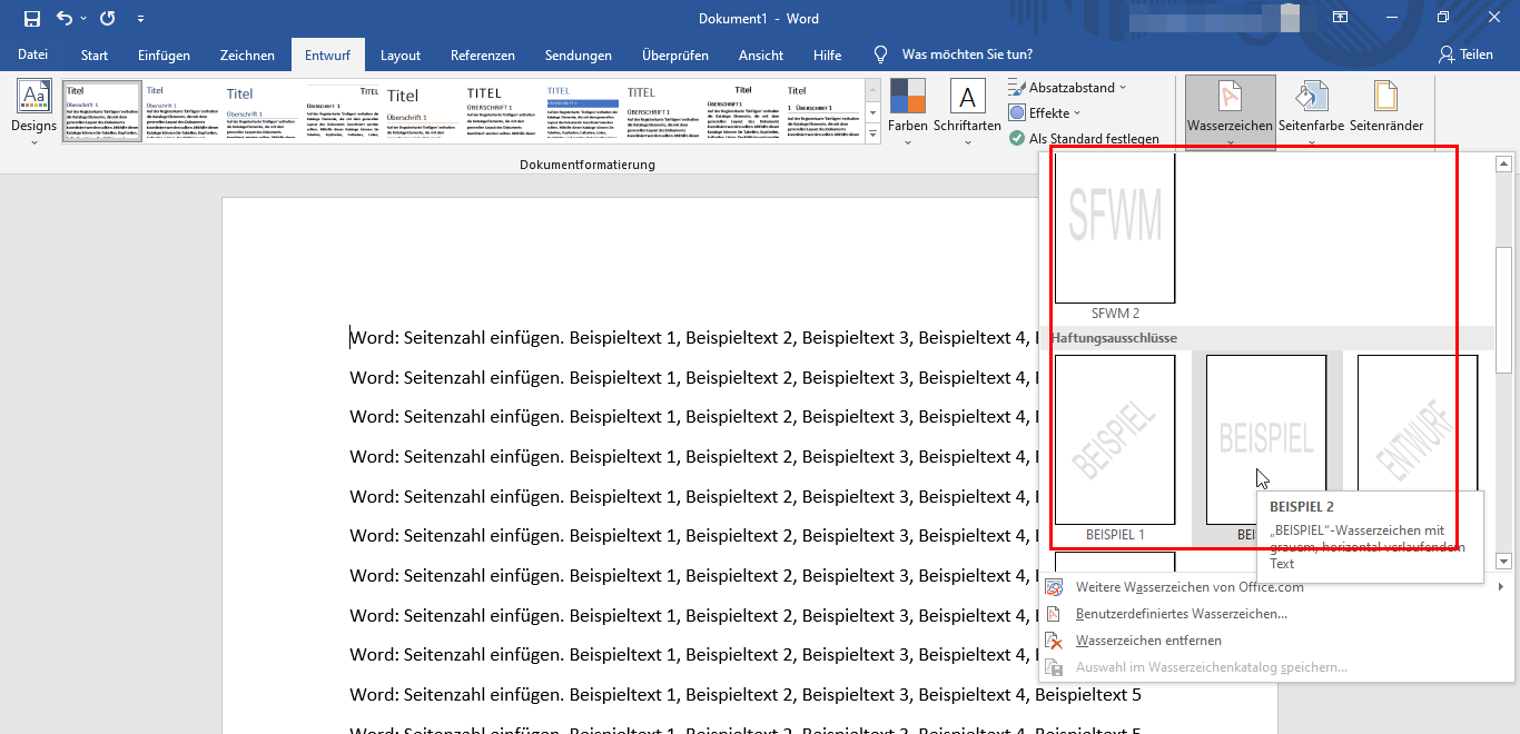 - Gehen Sie zum Reiter Entwurf und klicken Sie auf Wasserzeichen.