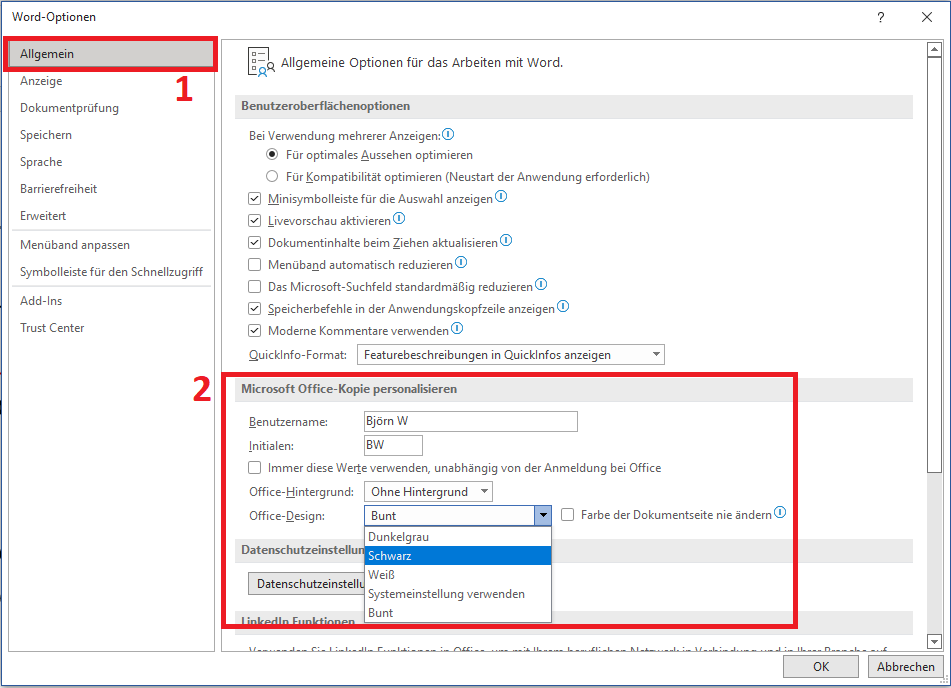 - Gehen Sie zu Datei > Optionen > Allgemein > Dieses Exemplar von Microsoft Office personalisieren.