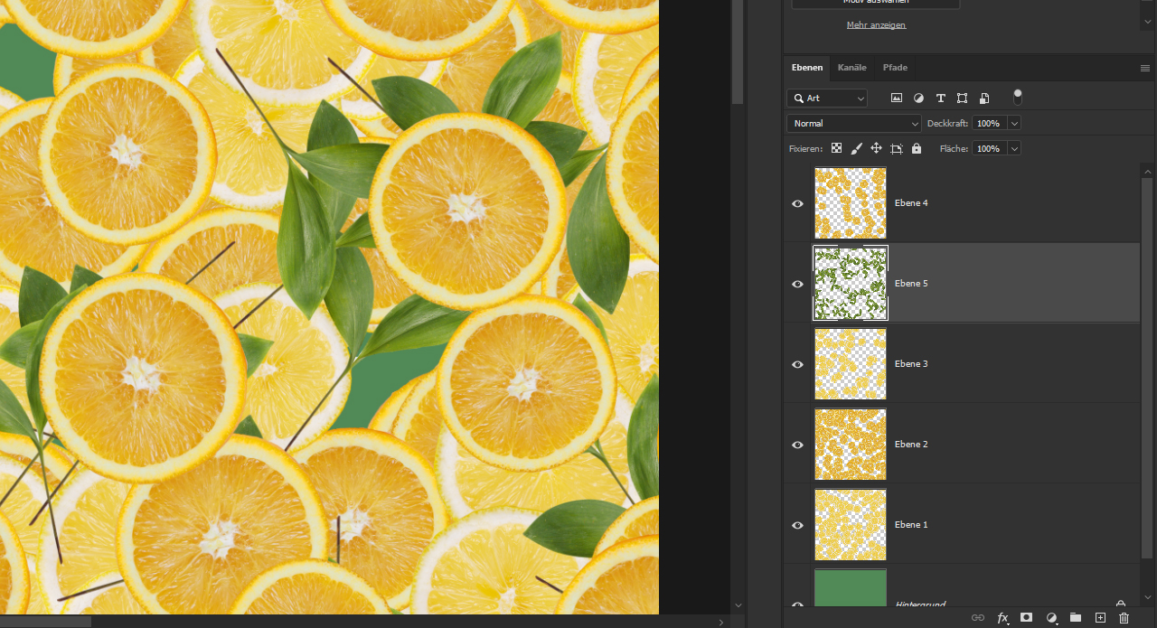 - Mehr Kontrast: Fügen Sie ein Musterelement in einer anderen Farbe hinzu, z.B. Blätter oder eine Pflanze. Erstellen Sie eine neue Ebene, füllen Sie sie mit dem Pflanzenmuster und ziehen Sie diese Ebene unter die oberste Musterebene.
