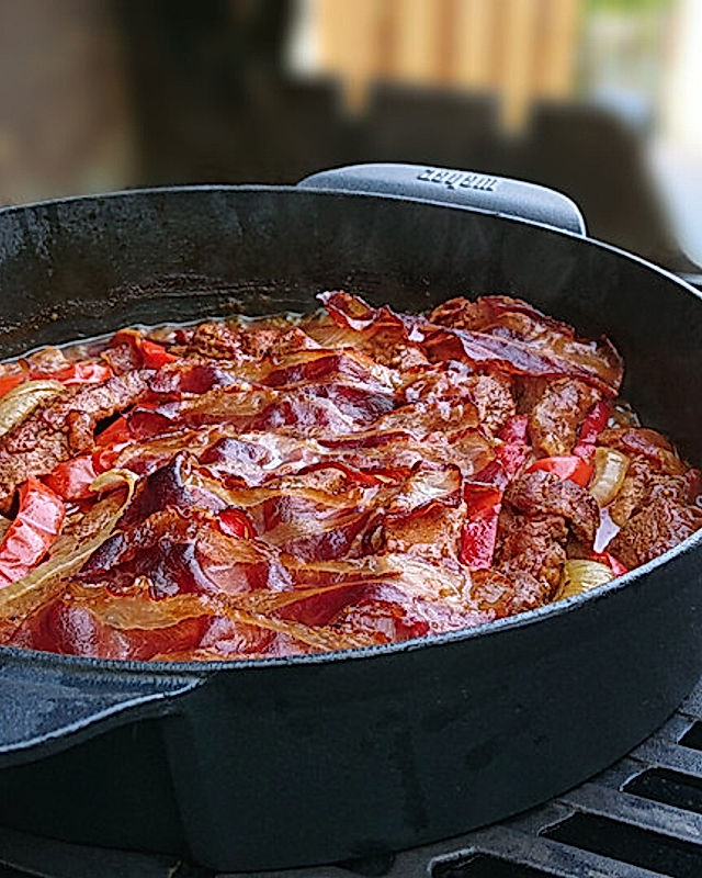 Schichtfleisch bezeichnet im Grunde ein Gericht, bei dem abwechselnd Fleisch und verschiedene Gemüsesorten wie Zwiebeln, Kartoffeln oder Paprika in einem Topf oder einer Form geschichtet werden. Diese Zubereitungsart erinnert an einen Auflauf und wird traditionell im Dutch Oven, einem gusseisernen Topf mit Deckel, zubereitet. Besonders bei Kochanfängern erfreut sich Schichtfleisch großer Beliebtheit, da es nahezu selbstständig im Topf gart und somit kaum schiefgehen kann.