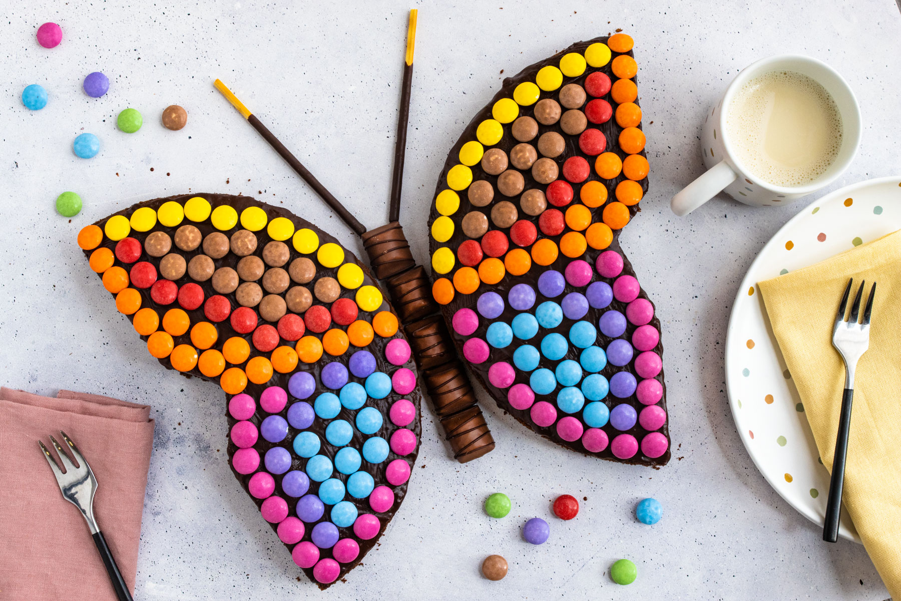 - Kreative Gestaltung: Nun beginnt der kreative Teil! Verzieren Sie die Schokoladenfläche mit den bunten Schokolinsen. Ihrer Fantasie sind keine Grenzen gesetzt: Sie können wilde Muster, Kreise oder einfach eine bunte Mischung legen. Wenn Sie ein Muster ähnlich dem Beispielbild wünschen, sind drei Päckchen Schokolinsen wahrscheinlich ausreichend. Drücken Sie die Linsen leicht in die Schokolade. Legen Sie den fertigen Kuchen auf einen großen Teller oder eine Servierplatte. Positionieren Sie die Kuchenhälften mit etwas Abstand zueinander, sodass Platz für den Schokoriegel als Körper des Schmetterlings bleibt. Zwei übereinander gelegte Schokoriegel ergeben in der Regel die passende Höhe für den Körper.