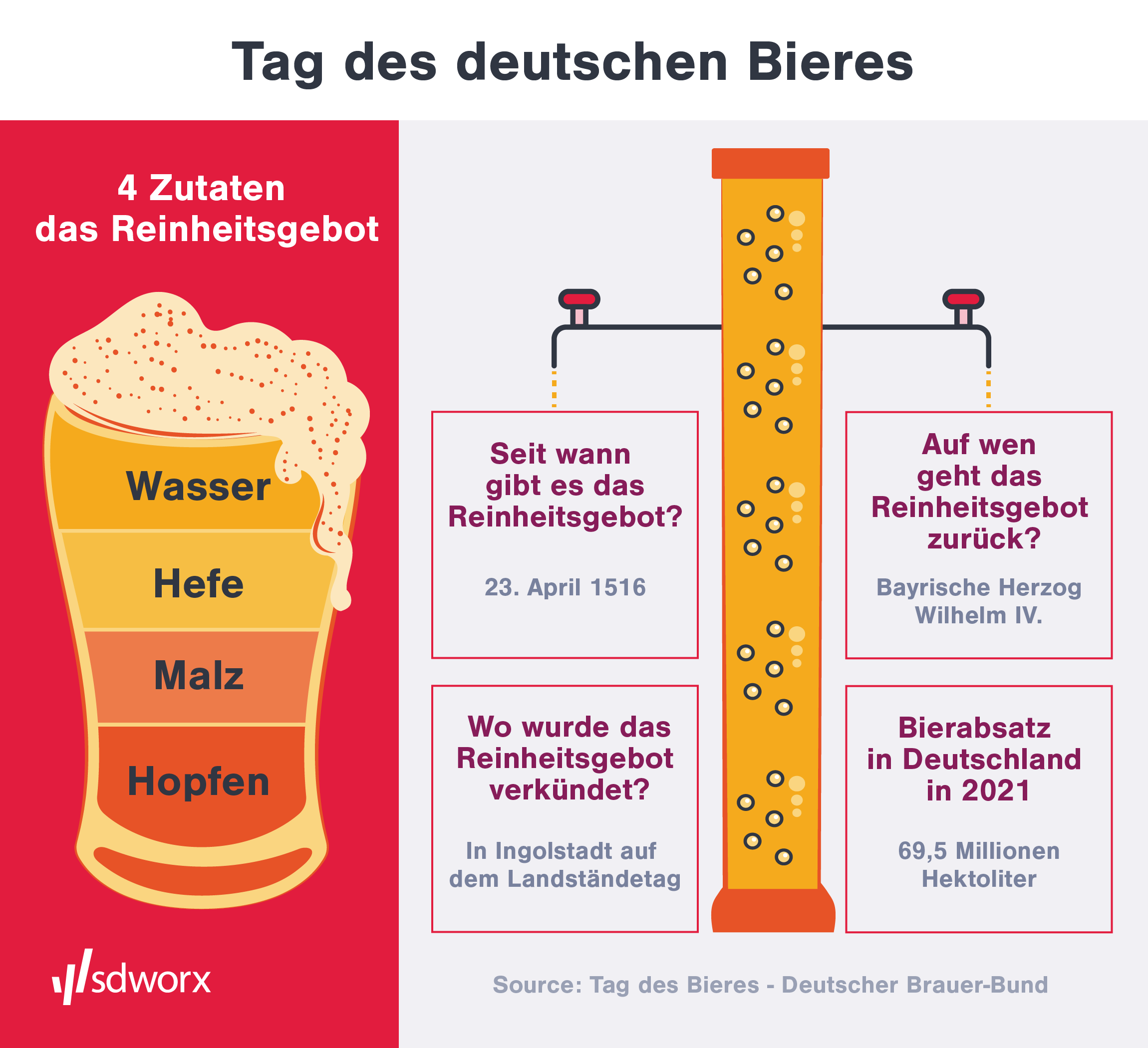 Das Reinheitsgebot für Bier wurde am 23. April 1516 vom bayerischen Herzog Wilhelm IV. erlassen. An diesem Tag wurde in Ingolstadt eine Landesordnung verkündet, die festlegte, welche Zutaten für das Bierbrauen verwendet werden durften. Ursprünglich waren dies nur Wasser, Gerste und Hopfen. Der Hefe, die erst später als wichtiger Bestandteil entdeckt wurde, war man sich damals noch nicht bewusst.